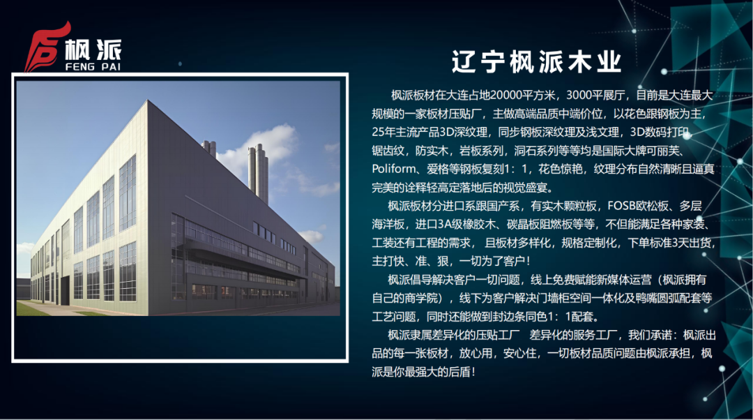 •       大连枫派新材料科技有限公司于2012年成立,自此开启了在板材领域的征程。作为大连市室内装饰协会常务理事单位,枫派将全部精力投入到板材的研发、生产与销售,凭借着持之以恒的努力和对品质的执着追求,逐渐在竞争激烈的市场中崭露头角。